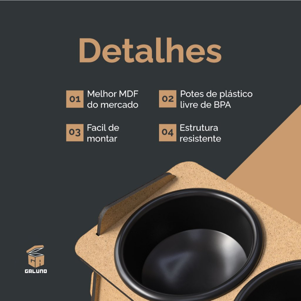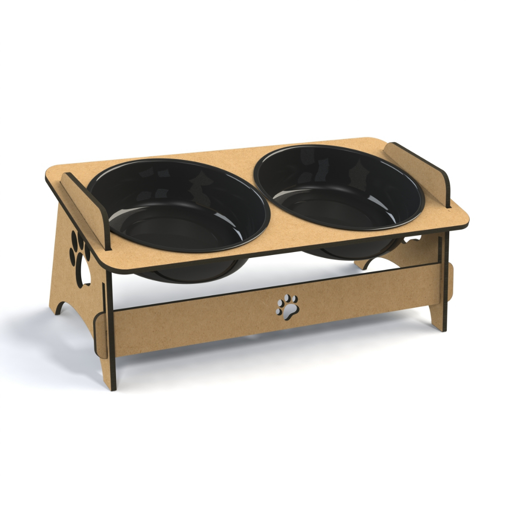 Este comedouro e bebedouro elevado em MDF, com duas tigelas removíveis, foi desenvolvido para trazer praticidade e bem-estar tanto para cães quanto para gatos de pequeno a médio porte.