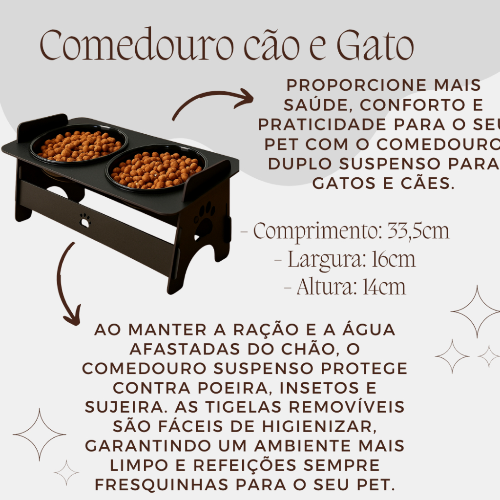 Transforme a hora da refeição do seu pet em um momento de conforto, estilo e praticidade! Nossos comedouros elevados em MDF preto com pote(s) inox foram cuidadosamente desenvolvidos para oferecer qualidade, higiene e design moderno. Seja para gatos domésticos ou cães de pequeno porte, cada detalhe foi pensado para tornar a alimentação mais saudável e elegante.