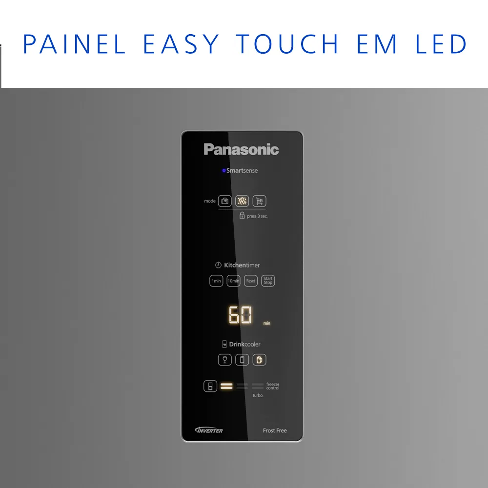 Painel que acende com o toque e permite o controle das funções da geladeira e temperatura do freezer. Além disso, também é possível utilizar a função Drink Cooler, que mostra o tempo necessário para que as bebidas alcancem a temperatura ideal, e a função Kitchen Timer, que pode ser usada como um temporizador de cozinha.