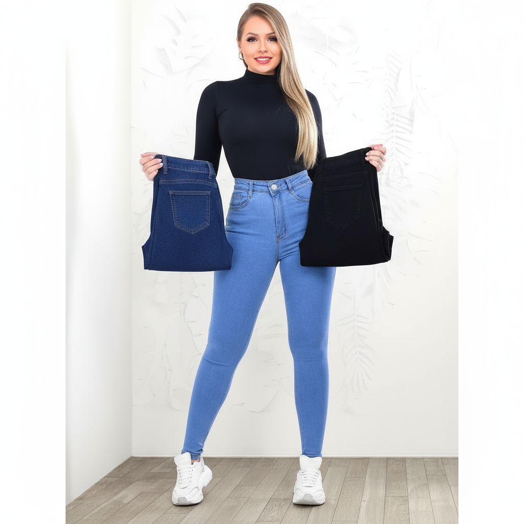 O jeans é atemporal e indispensável no guarda-roupa feminino. Este kit exclusivo com 3 calças skinny femininas (1 preta, 1 azul clara e 1 azul escura) traz versatilidade, conforto e estilo para você montar looks casuais, de lazer ou até mais sociais.