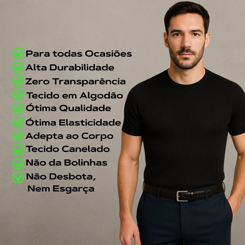 Eleve seu guarda-roupa com um kit de 3 camisetas masculinas caneladas slim, confeccionadas em tecido ribana premium com 98% algodão e 2% elastano, garantindo toque macio, caimento perfeito e durabilidade incomparável.