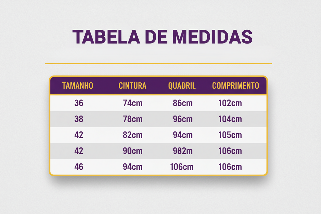 Confira nossa tabela de medidas para garantir o ajuste perfeito. Em caso de dúvidas sobre o tamanho, nossa equipe está pronta para ajudar!